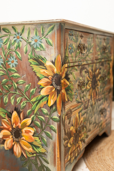 A beautiful solid wood chest of drawers, two-over-two, hand-painted one-off design by Lindsay Thompson