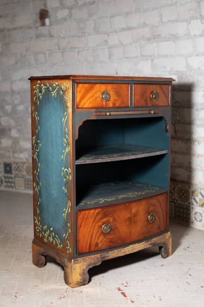 I have this gorgeous little side table for sale. The feet have been brushed with gold leaf, the sides and the inlays painted in teal blue with a hand-painted vine pattern. It's a very attractive, solid and useful piece.
