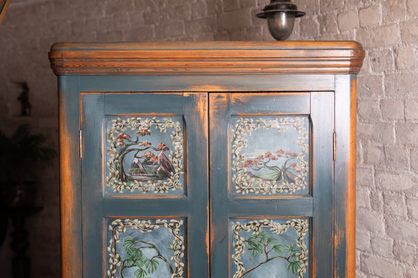 It's a gorgeous and substantial antique, solid wood (of course) with attractive cabriole legs giving it serious stature, with dovetail joints and boasting colours such as rich teals, electric blues, deep greens and a pop of pink.