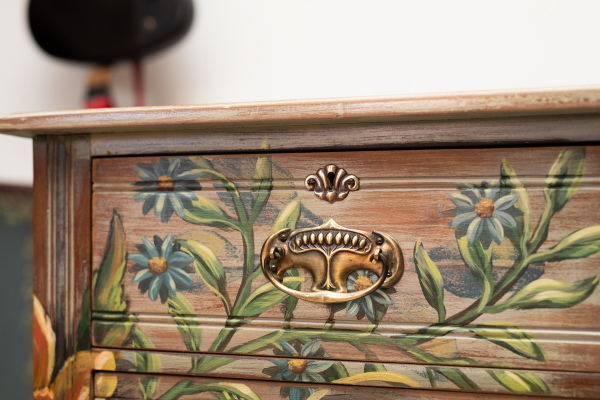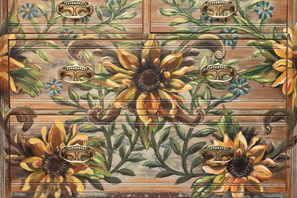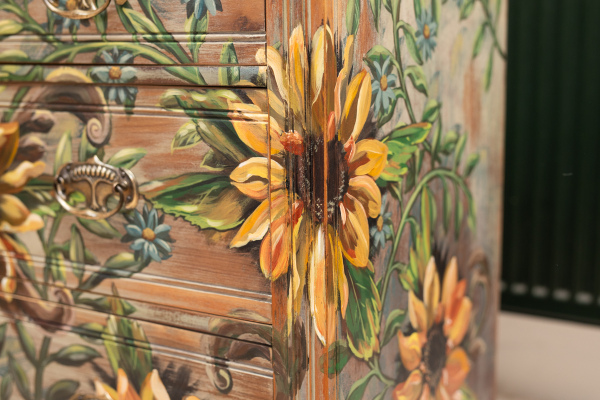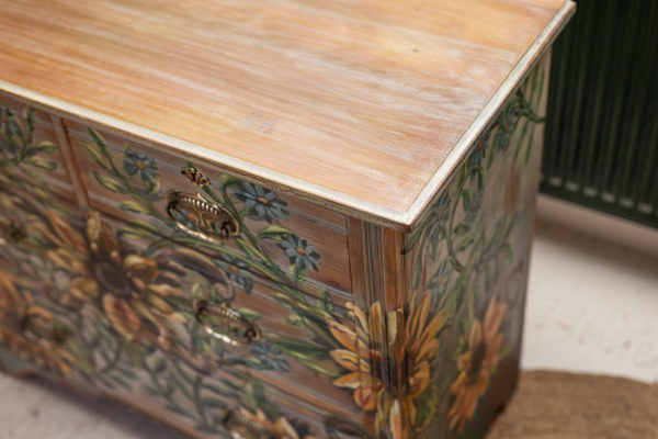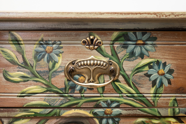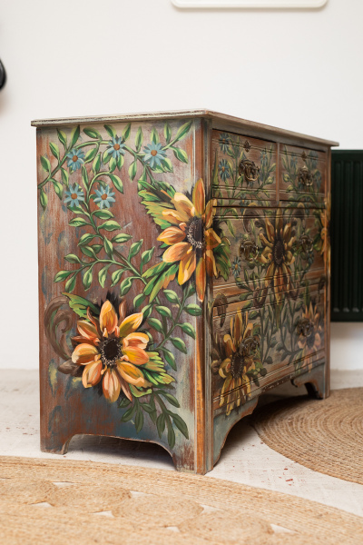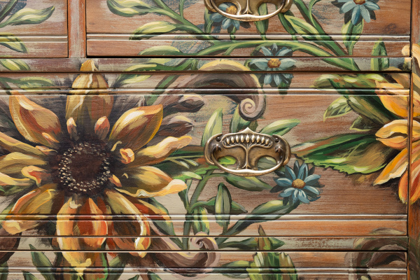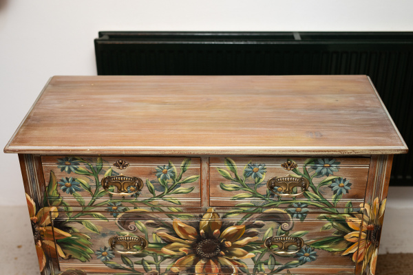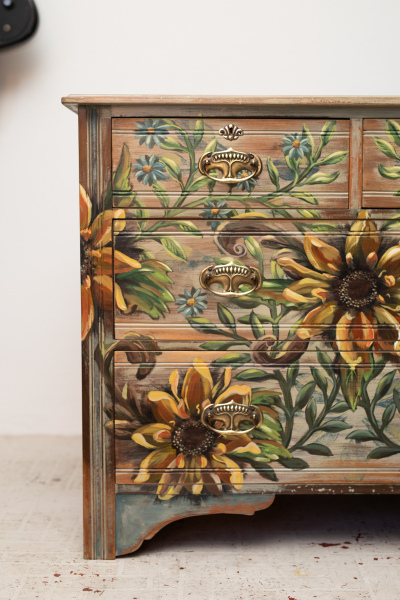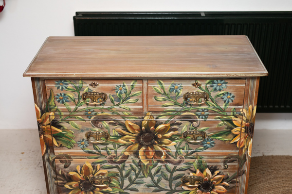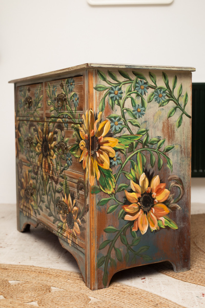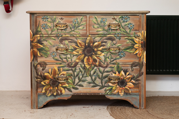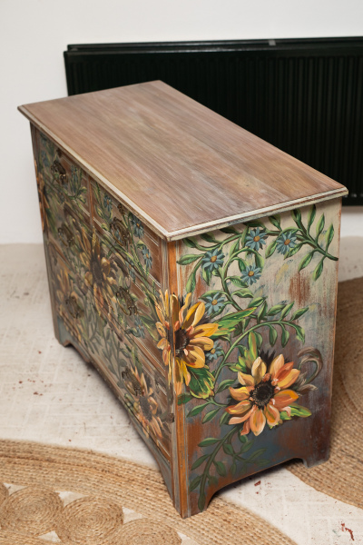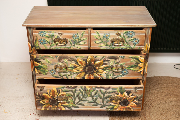 A beautiful solid wood chest of drawers, two-over-two, hand-painted one-off design by Lindsay Thompson