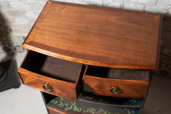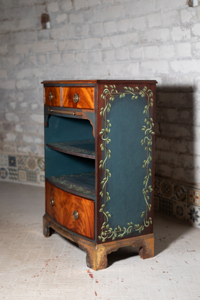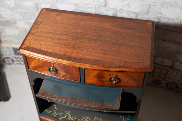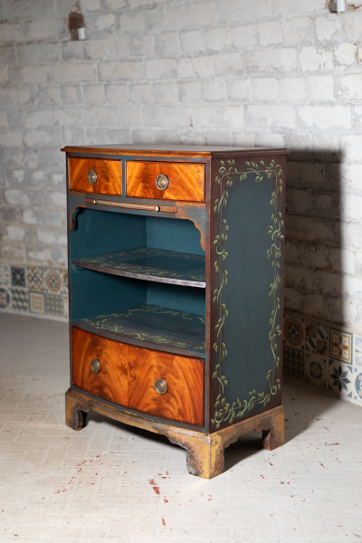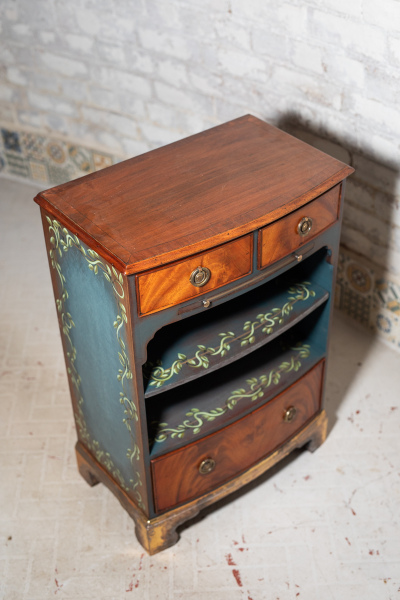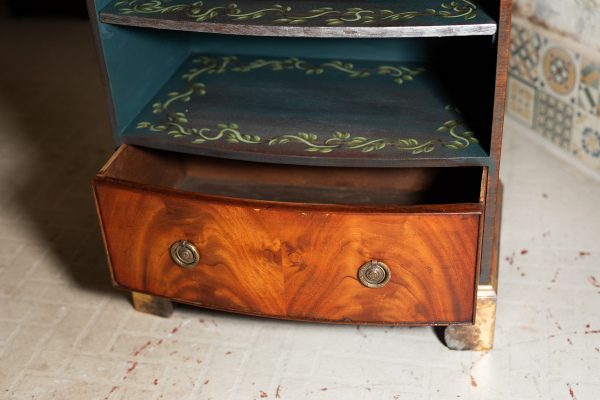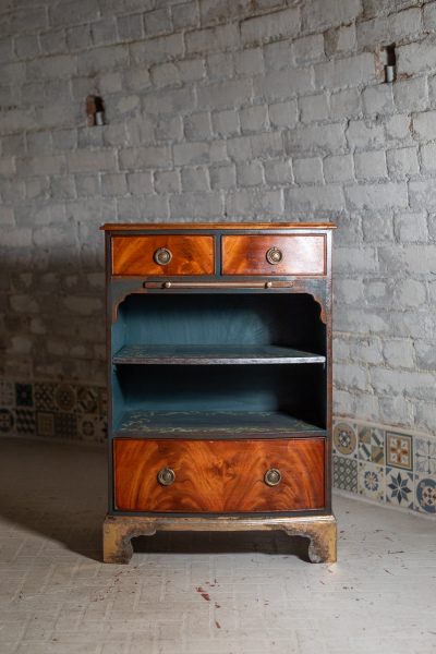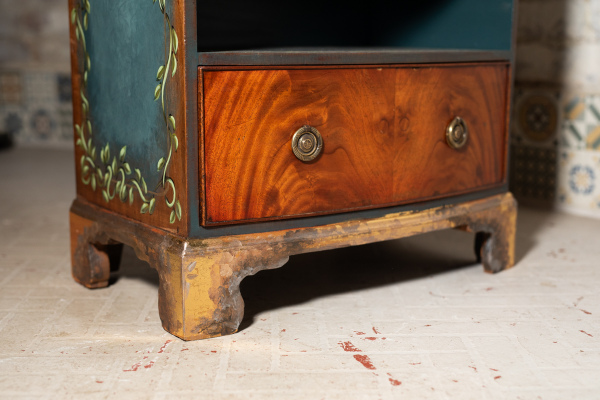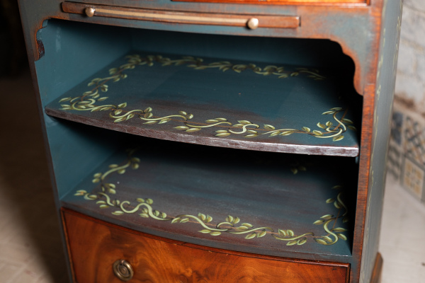 I have this gorgeous little side table for sale. The feet have been brushed with gold leaf, the sides and the inlays painted in teal blue with a hand-painted vine pattern. It's a very attractive, solid and useful piece.