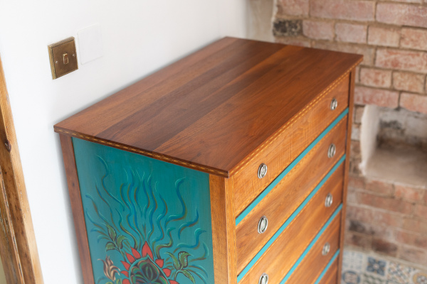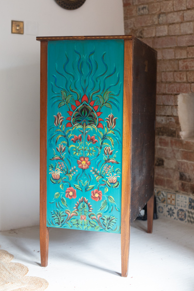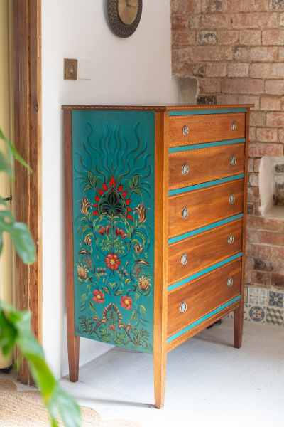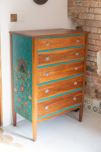 I have designed and hand painted this floral design which appears on both sides of the tallboy. It's a really beautiful piece. Solid, strong, dependable and beautiful.