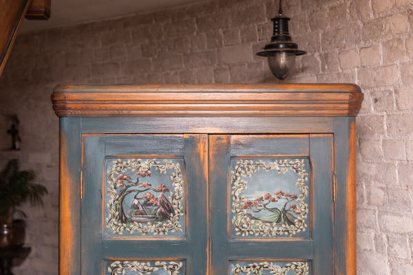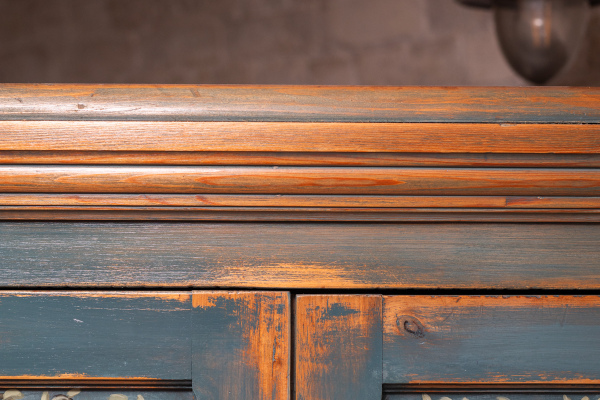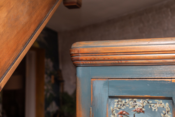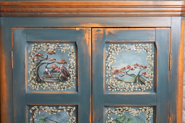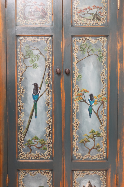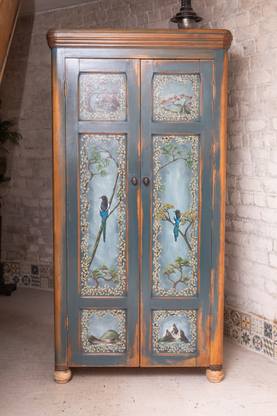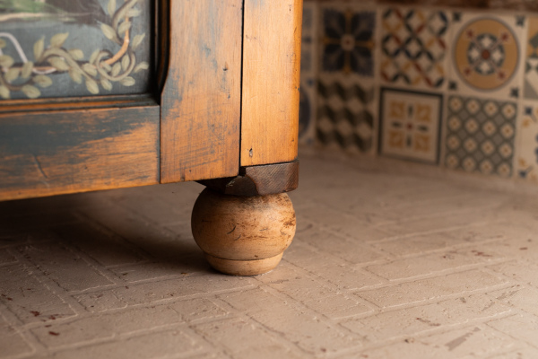 It's a gorgeous and substantial antique, solid wood (of course) with attractive cabriole legs giving it serious stature, with dovetail joints and boasting colours such as rich teals, electric blues, deep greens and a pop of pink.